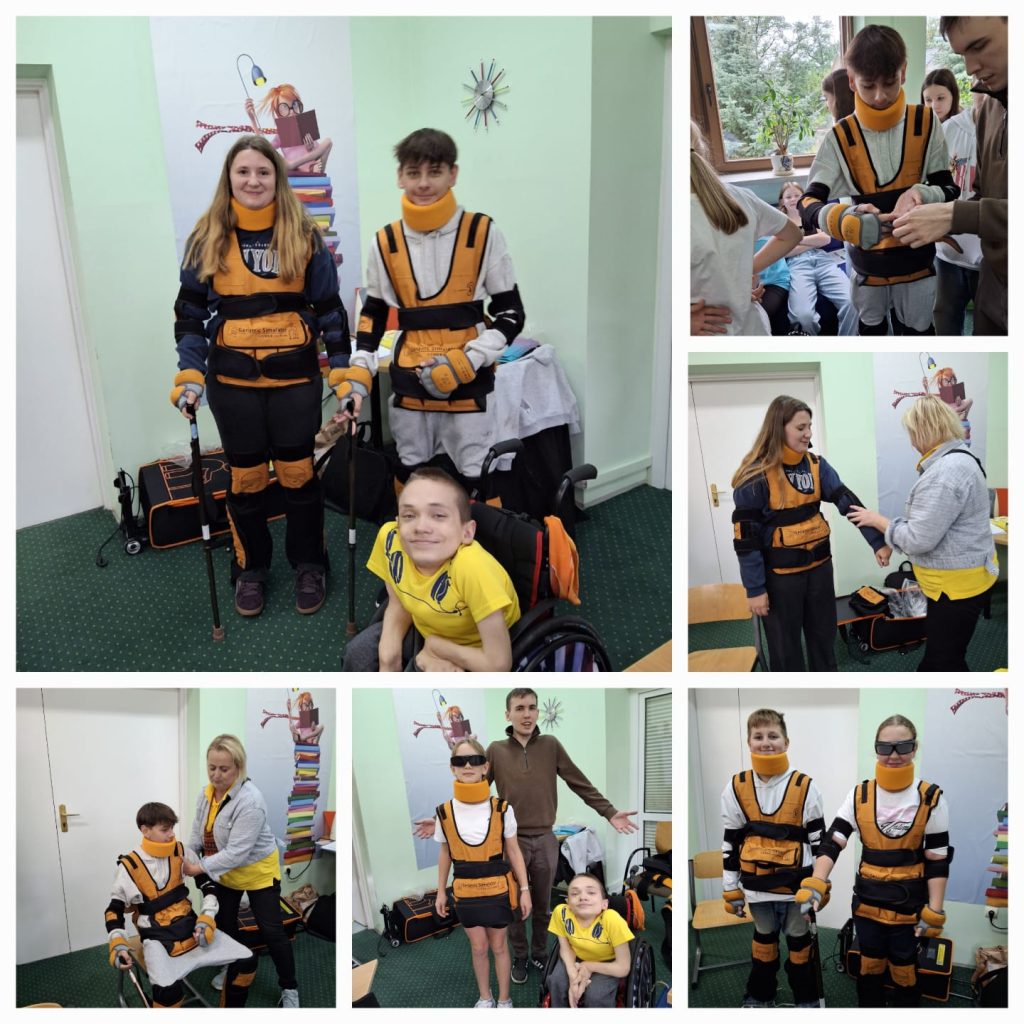 Główna część spotkania opierała się na doświadczeniu, które miało na celu uświadomienie młodzieży, jak trudne może być życie seniorów. Uczniowie mieli okazję przetestować symulator starości — specjalny kombinezon, który odwzorowuje fizyczne ograniczenia związane z wiekiem. Symulator ten zawierał różne elementy, które symulowały utratę wzroku, zmniejszoną siłę mięśniową oraz ograniczoną ruchomość. Dodatkowo, kombinezon wyposażony był w opaski na kolana i łokcie, które utrudniały wykonywanie prostych czynności, takich jak chodzenie czy podnoszenie przedmiotów. Uczniowie mogli założyć także specjalne okulary zmniejszające ostrość widzenia czy rękawice symulujące drżenie dłoni, charakterystyczne dla choroby Parkinsona.
