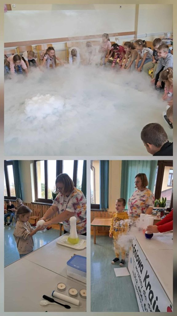 Dzieci dowiedziały się, że suchy lód to zestalony dwutlenek węgla (CO₂), który ma bardzo niską temperaturę i zamiast topić się, zamienia się bezpośrednio w gaz. Podczas pokazów mogły obserwować powstawanie białej mgły, samonadmuchujące się balony oraz bańki wypełnione dymem.