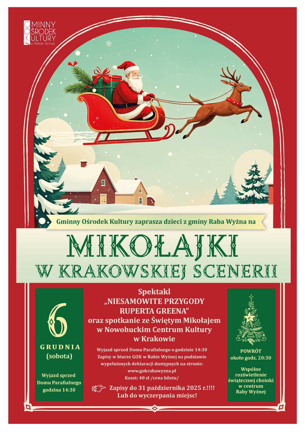 Gminny Ośrodek Kultury w Rabie Wyżnej 6 grudnia zaprasza dzieci z gminy Raba Wyżna na wyjazd mikołajkowy do Nowohuckiego Centrum Kultury w Krakowie, gdzie odbędzie się spektakl „Niesamowite przygody Ruperta Greena” oraz spotkanie ze Świętym Mikołajem. Wyjazd sprzed Domu Parafialnego o godzinie 14:30.