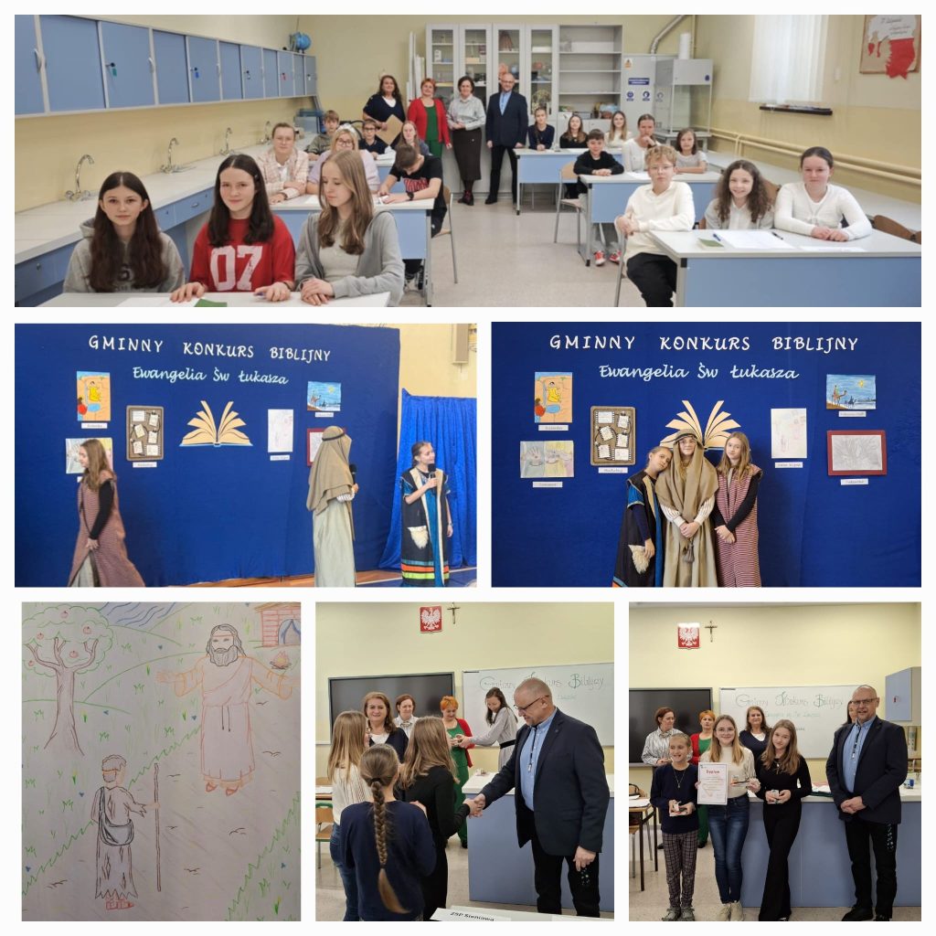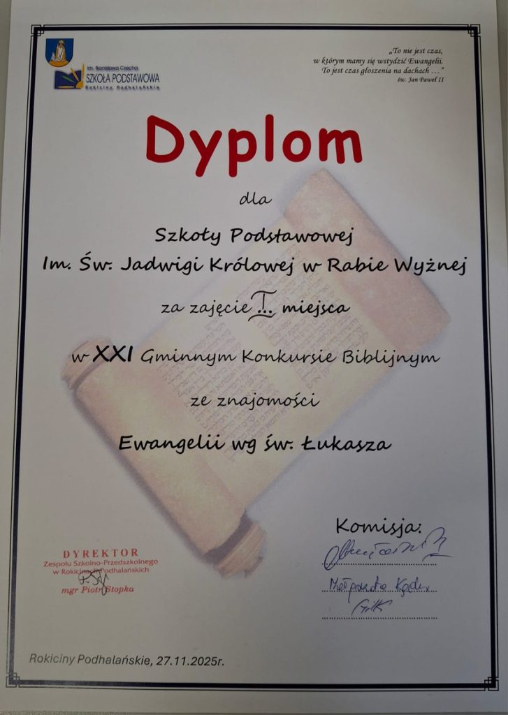 27 listopada 2025 r. w Rokicinach Podhalańskich odbył się XXI Gminny Konkurs Biblijny ze znajomości Ewangelii św. Łukasza. W wydarzeniu wzięły udział także uczennice z naszej szkoły: T. Franczyk. z kl. V a, K. Chrobak z kl. VII b i L. Skawiniak z kl. VIII c. Przygotowania do konkursu wymagały od naszych reprezentantek wielu dni pracy i zaangażowania. Uczennice samodzielnie przygotowały pracę plastyczną, która pięknie ilustrowała wybrany fragment Ewangelii, oraz włożyły ogrom wysiłku w opracowanie krótkiej scenki biblijnej o Synu Marnotrawnym. Każda próba była okazją do doskonalenia detali, dopracowania gestów i dialogów, tak aby scena oddawała głębię przesłania Pisma Świętego. Do tego doszło jeszcze rozwiązanie krzyżówki biblijnej, które wymagało znajomości Ewangelii św. Łukasza.