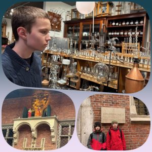 Pierwszym punktem programu była wycieczka po Dzielnicy Uniwersyteckiej i Starym Mieście pod hasłem „Krakowskie Lumen Chymicum”. Milena i Szczepan mieli okazję poznać miejsca związane z historią chemii oraz działalnością wybitnych polskich naukowców, którzy na przestrzeni wieków rozwijali naukę na Uniwersytecie Jagiellońskim. Podczas spaceru odkrywali także liczne ciekawostki dotyczące krakowskiego środowiska akademickiego, tradycji uniwersyteckich oraz historycznych obiektów, w których kształtowały się ważne dokonania naukowe. Dodatkowo, w oparciu o to, co zobaczyli i usłyszeli w trakcie porannego spaceru, rozwiązywali zadania na specjalnie przygotowanej karcie pracy, co pozwoliło im lepiej utrwalić zdobyte informacje oraz aktywnie uczestniczyć w odkrywaniu dziedzictwa naukowego Krakowa. Następnie wzięli udział w wykładzie w Collegium Novum zatytułowanym „Nauka zmienia świat”, który w przystępny sposób ukazywał znaczenie odkryć naukowych dla rozwoju współczesnej cywilizacji. Kolejnym elementem programu były zajęcia w Muzeum UJ „Karol Olszewski – dokonania i instrumentarium uczonego”, gdzie uczniowie poznali postać wybitnego fizyka i chemika – Karola Olszewskiego, jego odkrycia oraz aparaturę, którą posługiwał się w pracy badawczej.