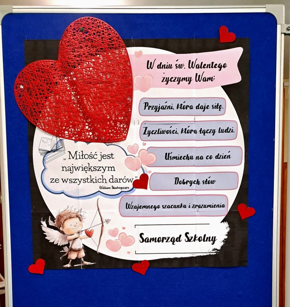 W związku z tym, iż walentynki w tym roku szkolnym przypadają w czasie ferii zimowych, zorganizowaliśmy to święto wcześniej. Samorząd Uczniowski przygotował słodkości oraz gotowe kartki walentynkowe dla zapominalskich. Nie zabrakło też poczty walentynkowej – specjalnej skrzynki, do której dzieci mogły wrzucać życzenia dla koleżanek, kolegów i nauczycieli. Była to doskonała okazja do okazania sobie sympatii, życzliwości i dzielenia się dobrym słowem.