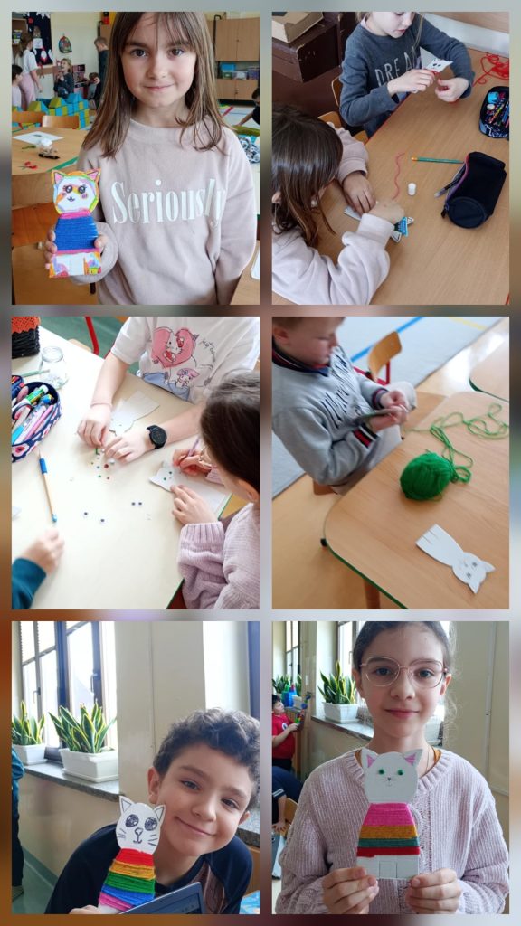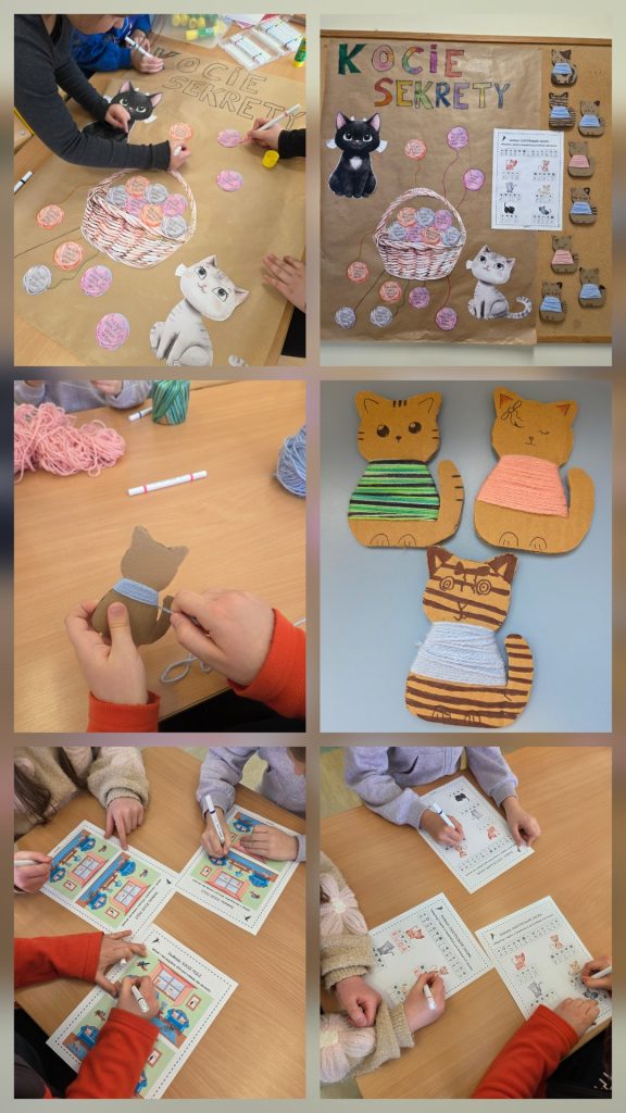 Podczas zajęć rozmawialiśmy o kocich zwyczajach. Uczniowie poznawali interesujące ciekawostki ukryte w „motkach” – każdy motek zawierał wyjątkową informację o kotach, ich zachowaniu, sposobach komunikacji oraz codziennych przyzwyczajeniach. Nie zabrakło również działań twórczych. W ramach pracy plastycznej dzieci wykonały kota z kartonu i włóczki. Powstały piękne, kolorowe i bardzo pomysłowe prace, które ozdobiły naszą świetlicę. Uczniowie chętnie zmierzyli się także z kocimi kartami pracy – „Znajdź różnicę” oraz „Zaszyfrowane imiona” rozwijały spostrzegawczość, koncentrację i logiczne myślenie. Na zakończenie odbyła się kocia gimnastyka, podczas której dzieci naśladowały kocie ruchy – przeciąganie się, ciche skradanie oraz zwinne podskoki. Było dużo śmiechu i dobrej zabawy!