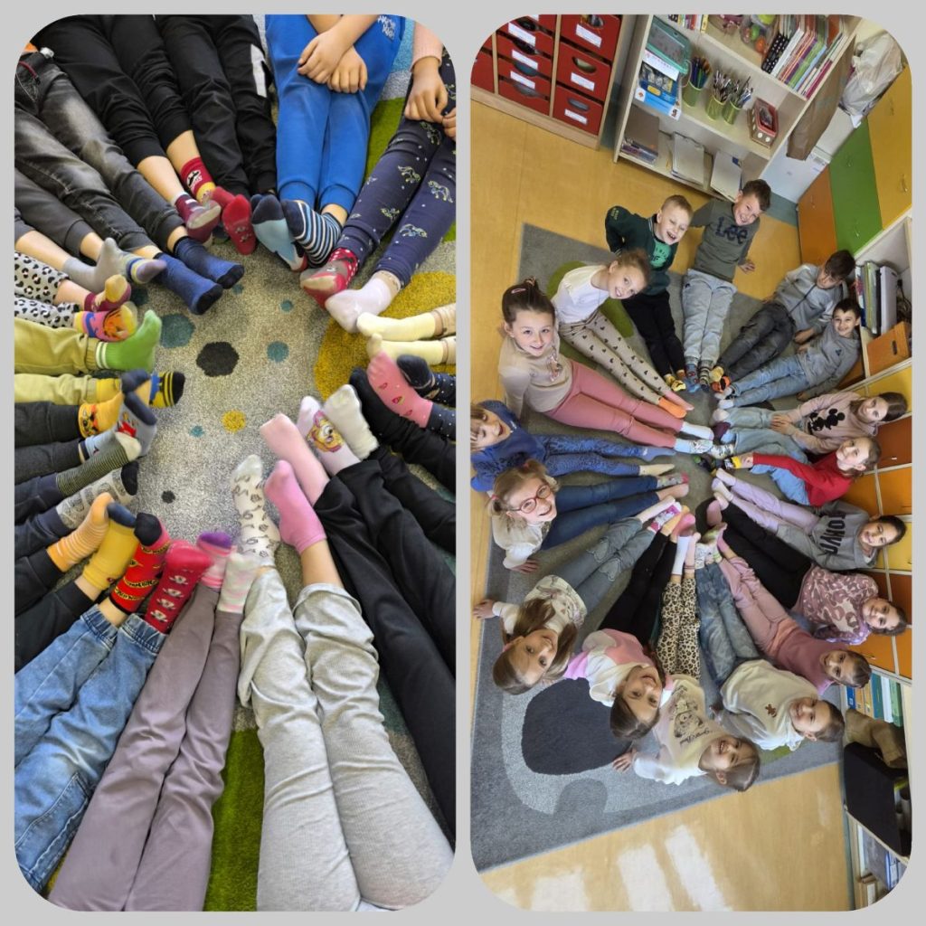Na szczególną uwagę zasługuje również Dzień Kolorowej Skarpetki, który był nie tylko zabawą, ale także ważnym gestem solidarności i akceptacji różnorodności. Tego dnia założyliśmy nie do pary skarpetki, pokazując swoją solidarność z osobami z Zespołem Downa.