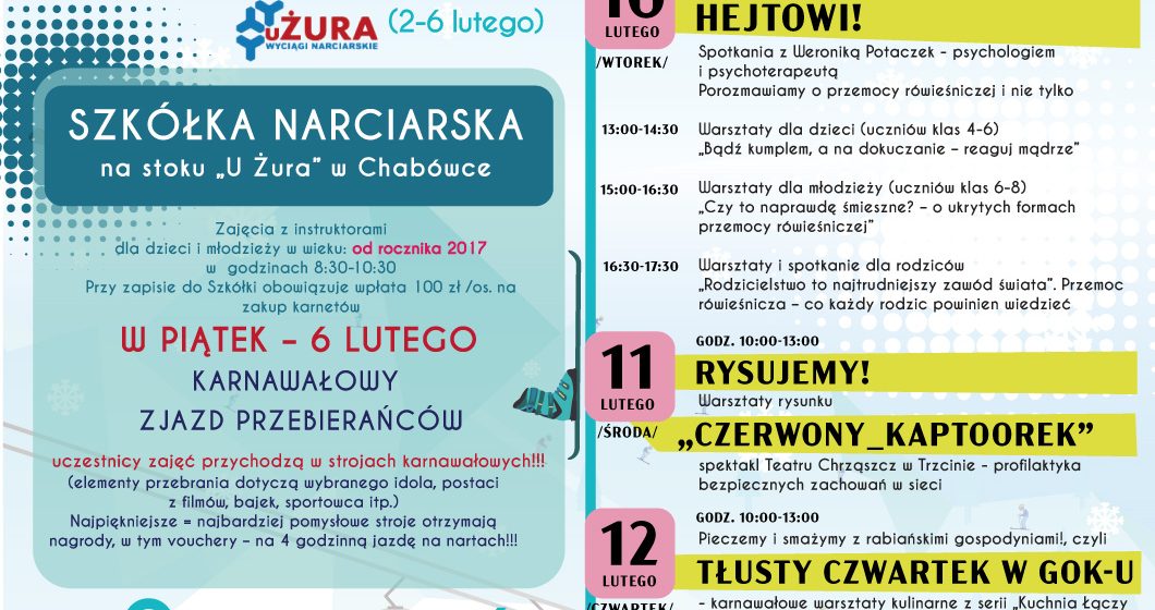 Gminny Ośrodek Kultury w Rabie Wyżnej zaprasza dzieci i młodzież z gminy Raba Wyżna na dwa tygodnie intensywnych, różnorodnych zajęć łączących sport, kulturę, edukację i karnawałową zabawę. Przed Wami narciarskie poranki, twórcze warsztaty, ważne rozmowy i wielki finał w bajkowym świecie – tak zapowiadają się w tym roku „Ferie […]